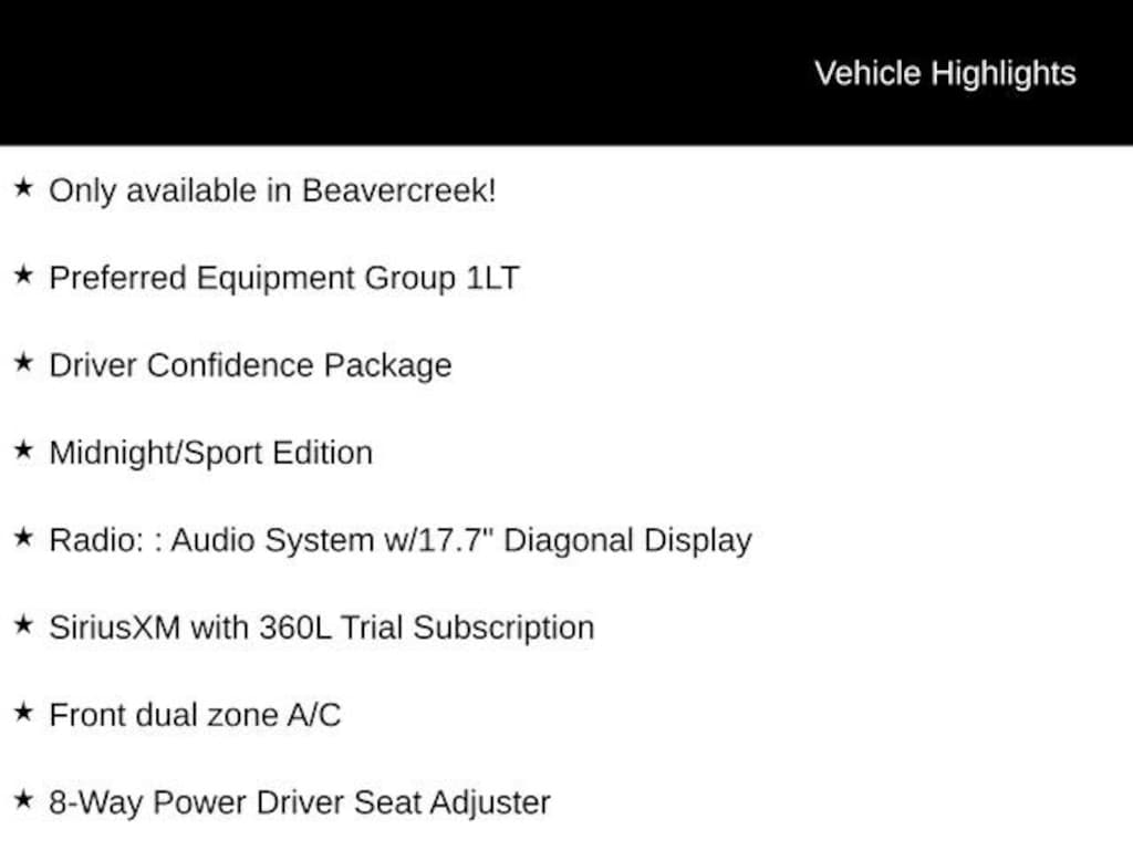 Only available in Beavercreek!, 8-Way Power Driver Seat Adjuster, Driver Confidence Package, Evotex Seat Trim, Front dual zone A/C, HD Surround Vision, Heated Driver and Front Passenger Seats, Heated steering wheel, High Gloss Black Door Upper Molding, Key Card, Midnight/Sport Edition, Power Liftgate, Power Outlet, Preferred Equipment Group 1LT, Radio: : Audio System w/17.7 Diagonal Display, Rear Camera Mirror, Rear Pedestrian Alert, SiriusXM with 360L Trial Subscription, Traffic Sign Recognition, Wheels: 20 High Gloss Black Painted Aluminum. 20/26 City/Highway MPG